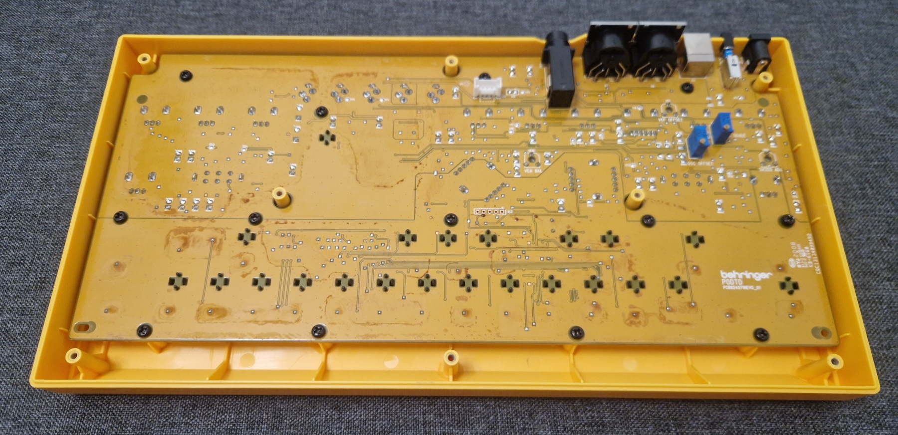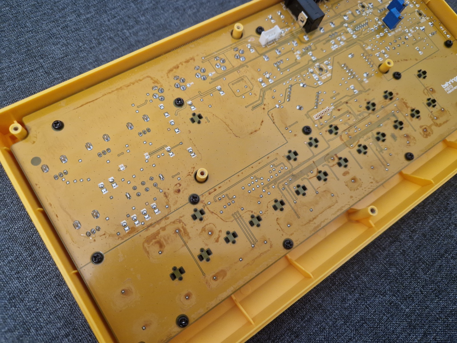 This time I’m back with a small and cheap one: the Behringer TD-3. You might ask if repairing such an inexpensive device is worth it. In my opinion – yes. I’m not a fan of today’s throw-away culture, where even small faults mean the end of a device. This attitude often goes far beyond electronics. In this case the problem was no sound (or very quiet and distorted sound) from the headphone output and the main OUT. The unit had been flooded with some liquid (something like brown syrup). I also fixed a few cold solder joints and replaced 4 electrolytic capacitors. And that was it!