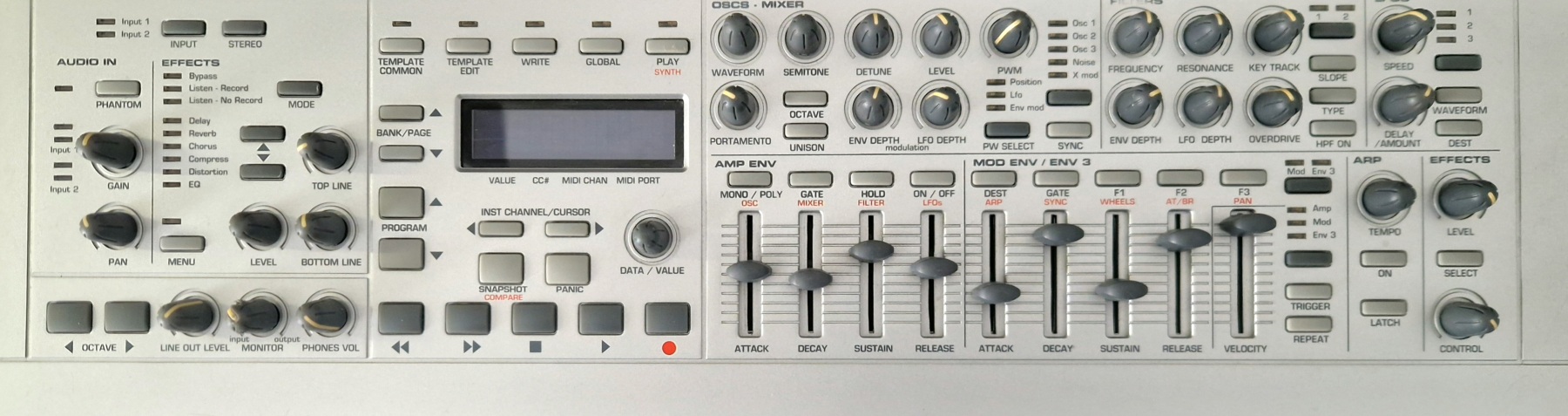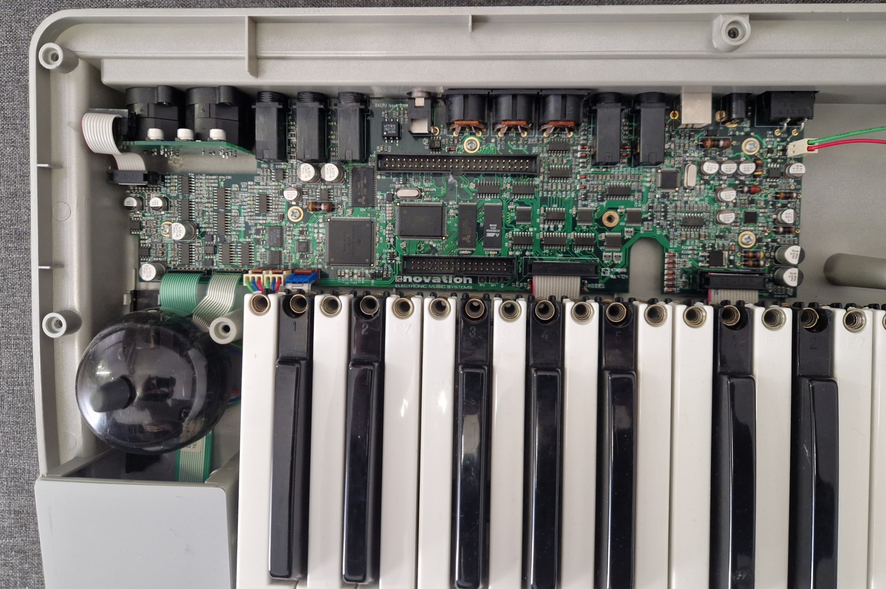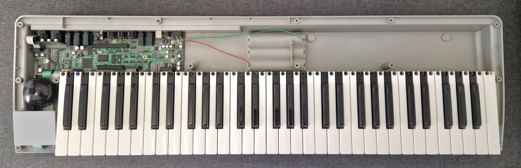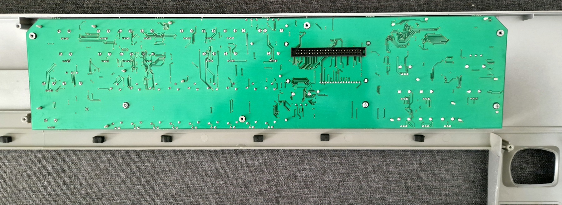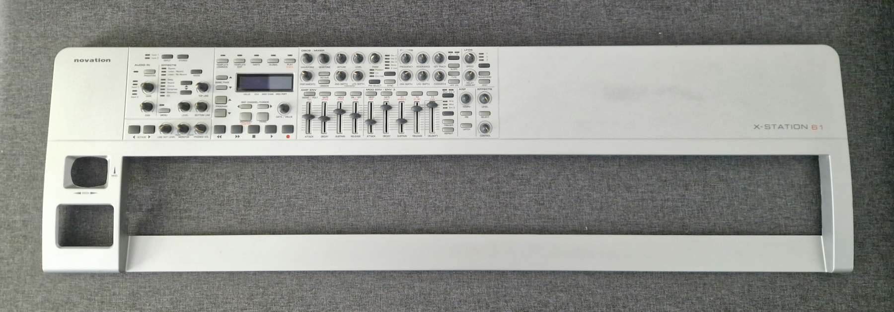This time it’s quite a simple repair — provided you have the right service equipment. The task was to replace the display in a rather unusual synthesizer, the Novation X-Station 61. The original display had lost contrast and also showed stains caused by a spill of some unknown liquid. It was replaced with a compatible equivalent, which are fairly easy to find on the market, since in this case we’re dealing with a 2×16 character alphanumeric display driven by a Hitachi HD44780-compatible controller.