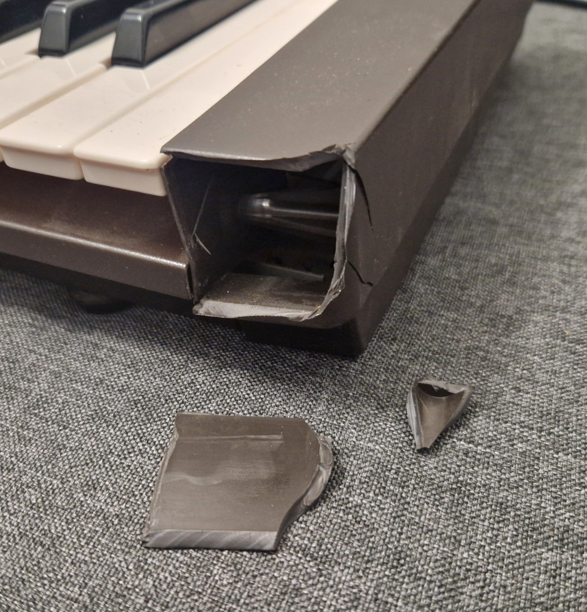This time I wanted to show you the repair — or rather the restoration — of my instrument, which I bought recently. The repair was unusual because it required some mechanical work. The very clever seller packed this delicate and heavy instrument in thin cardboard, like a shoebox, and the rest of the damage was done by the courier company (DPD — I don’t recommend them, second bad experience). One of the plastic side panels was broken (shattered).