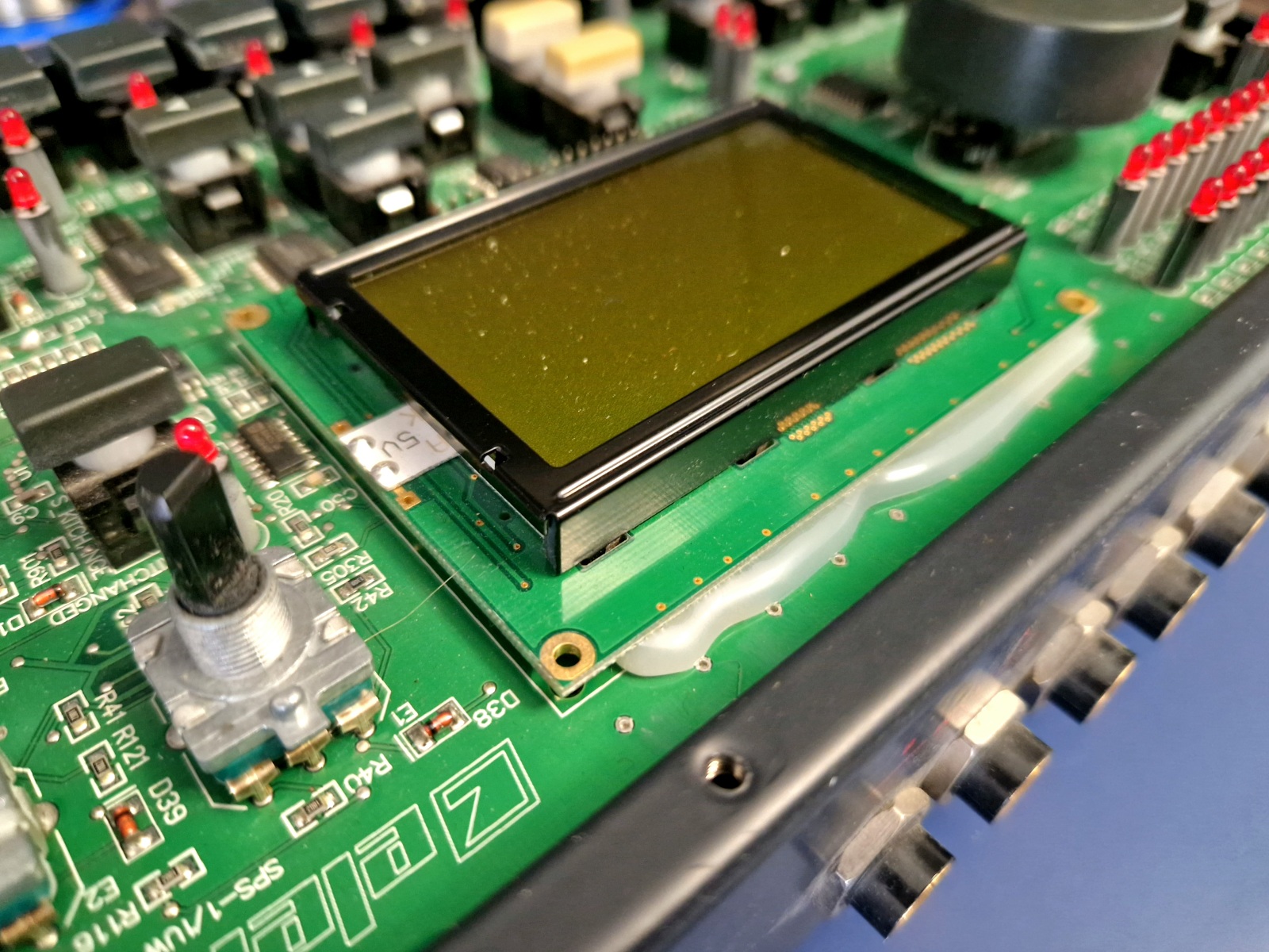 First of all, although the instrument has a very solid construction and is generally easy to service, the manufacturer — for some reason — glued the original display to the front panel PCB in two places, and in two different ways. Instead of using proper spacers and mounting holes, they poured a large amount of hot glue between the display PCB and the panel PCB. On top of that, they used a strong adhesive (something like cyanoacrylate) to glue the goldpin connector to the display PCB. As a result, disassembly was difficult and risky, even with all the right soldering tools. I have no idea why they did this, especially since the board had proper holes prepared for professional mounting. I’ve seen the same setup in many pictures online, so this wasn’t an isolated case.
